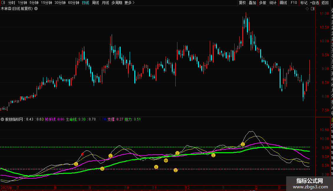 使用方法:所有的妖股都是主力长期积蓄筹码后进而拉升的结果,所以转折线穿越生命线是它的基本条件(个别也有即将穿越的),在这之前主力可能已经试盘拉了一小波,盘面上就会出现涨停板,出现小幅高度(前高),当正式启动后,必然突破前高。这里的大阳线穿越转折线或者突破前高就是启动的标志。这时,就该重点关注了。以后的走势,K线下有红箭头,一看就清楚了。