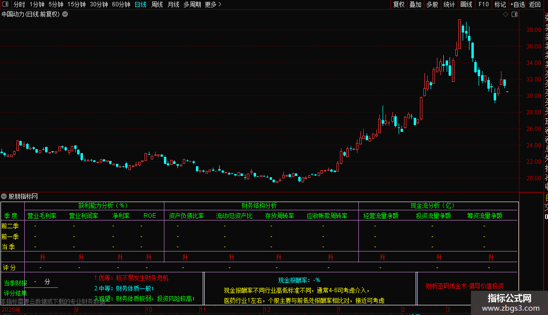 DRAWTEXT_FIX(ISLASTBAR,0.18,N1*8,0,'2.中等:财务体质一般;'),COLORCYAN;