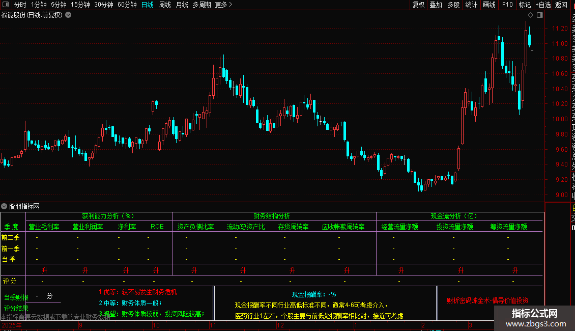 DRAWTEXT_FIX(ISLASTBAR,0.18,N1*9,0,'3.观望:财务体质较弱,投资风险较高;'),COLORGREEN;