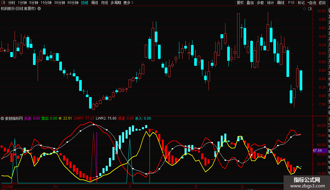 卖出:IF(D>75 AND CROSS(D,K) ,80,0),COLORGREEN,STICK;