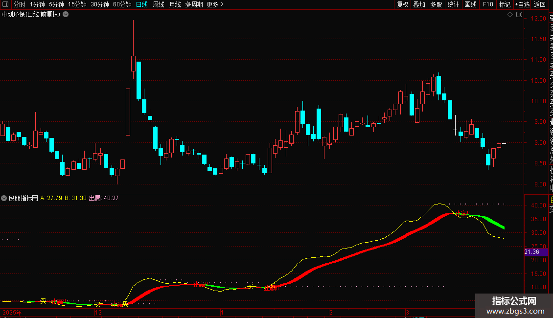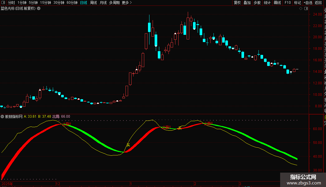 出局:REF(A,BARSLAST(CROSS(REF(A,3),A))+1),POINTDOT,COLORD3A9FF,LINETHICK2;
