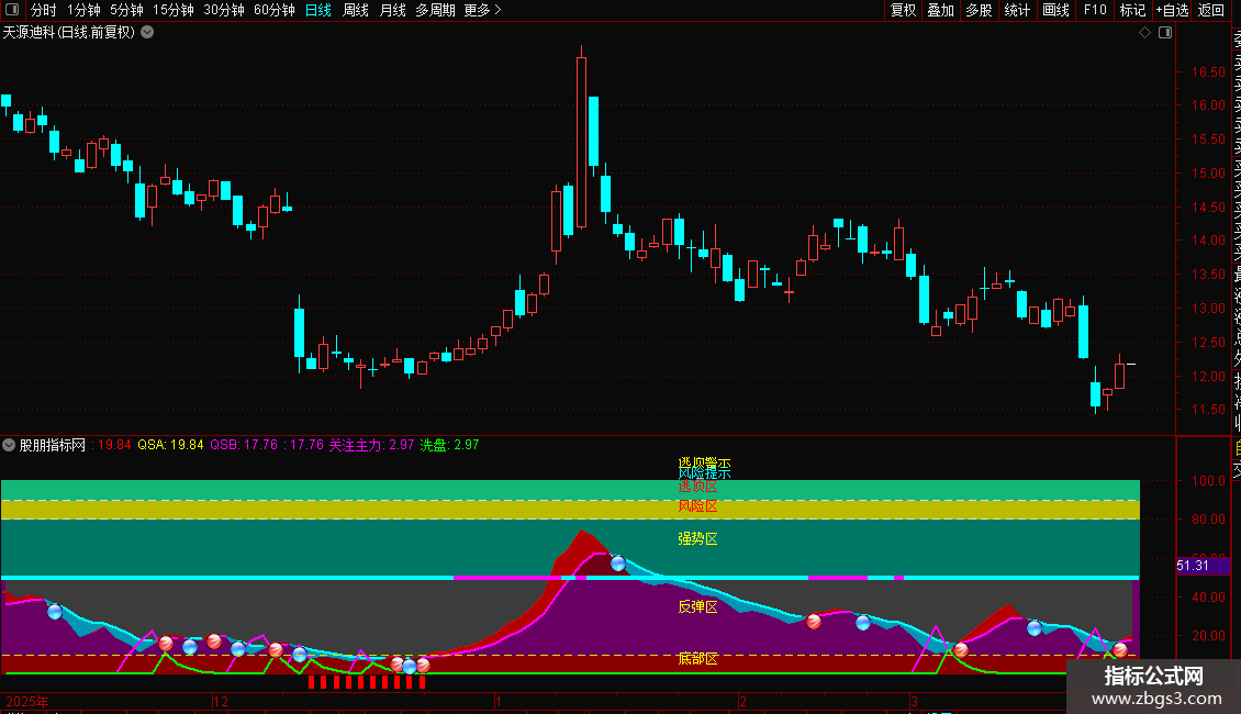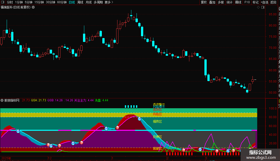 STICKLINE(C>0,0,10,5,0),COLOR00008A; STICKLINE(C>0,10,50,5,0),COLOR63006A; STICKLINE(C>0,50,80,5,0),COLOR657600; STICKLINE(C>0,80,90,5,0),COLOR00BBBB; STICKLINE(C>0,90,100,5,0),COLOR79B715; 趋势A:=SMA(((CLOSE-LLV(LOW,28))/(HHV(HIGH,28)-LLV(LOW,28))*100),3,1) ,COLORGREEN,LINETHICK2; DRAWBAND(趋势A,RGB(110,0,20),50,RGB(60,60,60)); IF(趋势A>REF(趋势A,1), 趋势A,DRAWNULL), COLORRED,LINETHICK2; 趋势B:=SMA(趋势A,3,1),COLOR00FFFF, LINETHICK2; QSA:趋势A; QSB:趋势B; DRAWBAND(QSA,RGB(180,0,0),QSB,RGB(0,150,180)); IF( 趋势A>趋势B,趋势B,DRAWNULL), COLORFF00FF, LINETHICK2; IF( 趋势A<趋势B,趋势B,DRAWNULL) ,COLORFFFF00,LINETHICK2; RSV:=(CLOSE-LLV(CLOSE,9))/(HHV(CLOSE,9)-LLV(CLOSE,9))*100; K:=SMA(RSV,3,1); D:=SMA(K,3,1); TYP:=(HIGH+LOW+CLOSE)/3; CCI:=(TYP-MA(TYP,14))/(0.015*AVEDEV(TYP,14)); DIFF:=EMA(CLOSE,2)-EMA(CLOSE,55); DEA:=EMA(DIFF,6); MACD:=2*(DIFF-DEA); 拐点:=IF(K>D AND CCI>0 AND DIFF>DEA AND MACD>0,1,0); STICKLINE(拐点=1,49,51,4,0),COLORFF00FF; STICKLINE(拐点=0,49,51,4,0),COLORCYAN; VR2:=REF(LOW,1); VR3:=SMA(ABS(LOW-VR2),3,1)/SMA(MAX(LOW-VR2,0),3,1)*100; VR4:=EMA(IF(CLOSE*1.3,VR3*10,VR3/10),3); VR5:=LLV(LOW,30); VR6:=HHV(VR4,30); VR7:=IF(MA(CLOSE,58),1,0); VR8:=EMA(IF(LOW<=VR5,(VR4+VR6*2)/2,0),3)/618*VR7; VR9:=IF(VR8>100,100,VR8); 关注主力:IF(VR9>-150,VR9,0),COLORFF00FF,LINETHICK2; 洗盘:IF(VR9<REF(VR9,1),VR9,0),COLORGREEN,LINETHICK2; DRAWICON(CROSS(趋势A,趋势B),趋势A,13); DRAWICON(CROSS(趋势B,趋势A),趋势B,14); DRAWICON(CROSS(90,趋势A),98,12); STICKLINE(趋势A>=90,102,112,1,0),COLOR00FFFF; STICKLINE(趋势A>=80,102,107,1,0),COLORFFFF00; STICKLINE(趋势A<=10,-1,-7,1,0),COLOR0000FF; STICKLINE(C>0,90,90,2,0),COLORDDDDDD; STICKLINE(C>0,80,80,2,0),COLORDDDDDD; STICKLINE(C>0,10,10,2,0),COLOR00DDDD; DRAWTEXT(CURRBARSCOUNT=38,8,'底部区'),COLOR00FFFF; DRAWTEXT(CURRBARSCOUNT=38,35,'反弹区'),COLOR00FFFF; DRAWTEXT(CURRBARSCOUNT=38,70,'强势区'),COLOR00FFFF; DRAWTEXT(CURRBARSCOUNT=38,87,'风险区'),COLOR0000FF; DRAWTEXT(CURRBARSCOUNT=38,97,'逃顶区'),COLOR0000FF; DRAWTEXT(CURRBARSCOUNT=38,104,'风险提示'),COLORFFFF00; DRAWTEXT(CURRBARSCOUNT=38,110,'逃顶警示'),COLOR00FFFF;