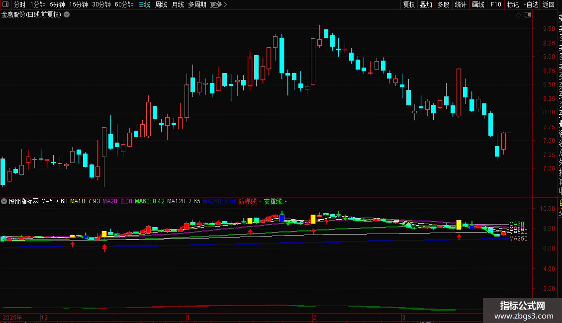 支撑线:IF(CLOSE<REF(CLOSE,1),CLOSE,DRAWNULL),COLORGREEN,LINETHICK2;