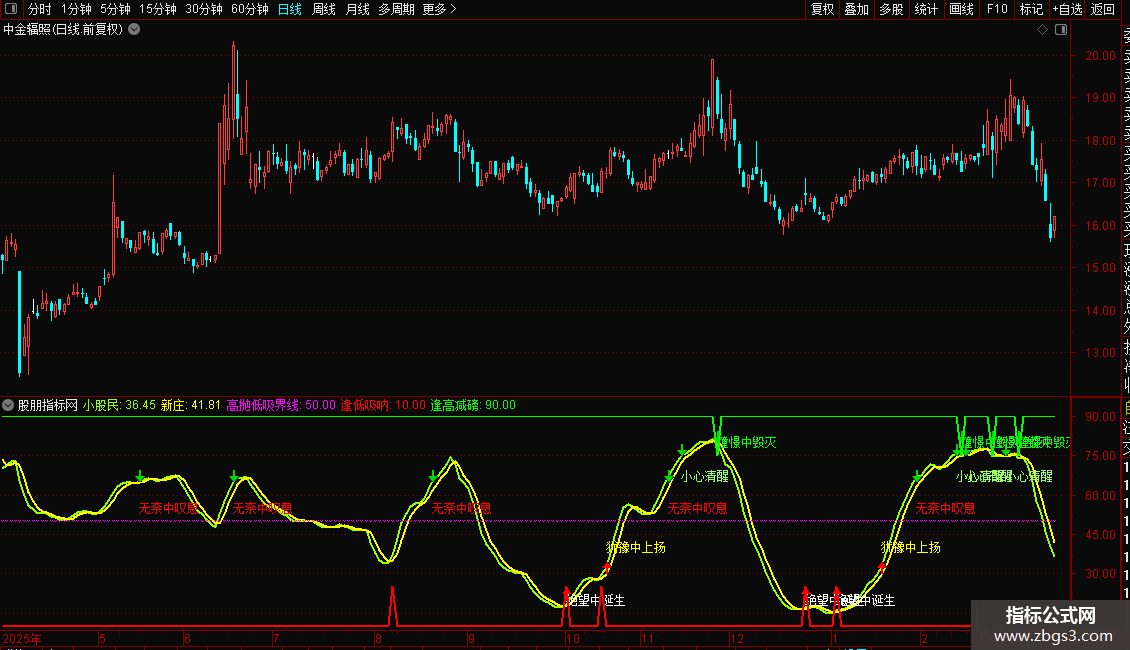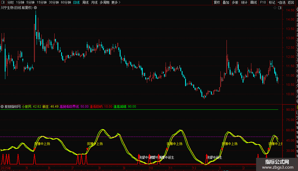 逢低吸呐: IF(CROSS(小股民,新庄) AND 小股民<40,25,10),COLORRED,LINETHICK2;
