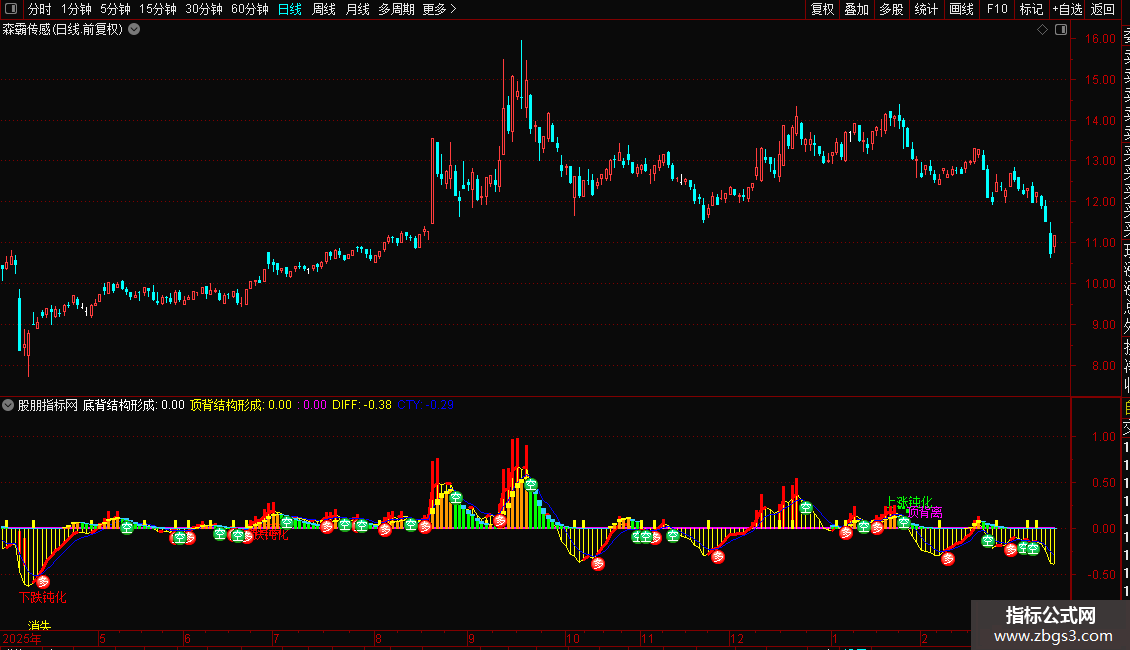 TG:=((MDIFT2<REF(MDIFT2,1))*REF(直接顶背离,1)) OR ((MDIFT3<REF(MDIFT3,1))*REF(隔峰顶背离,1)),NODRAW;