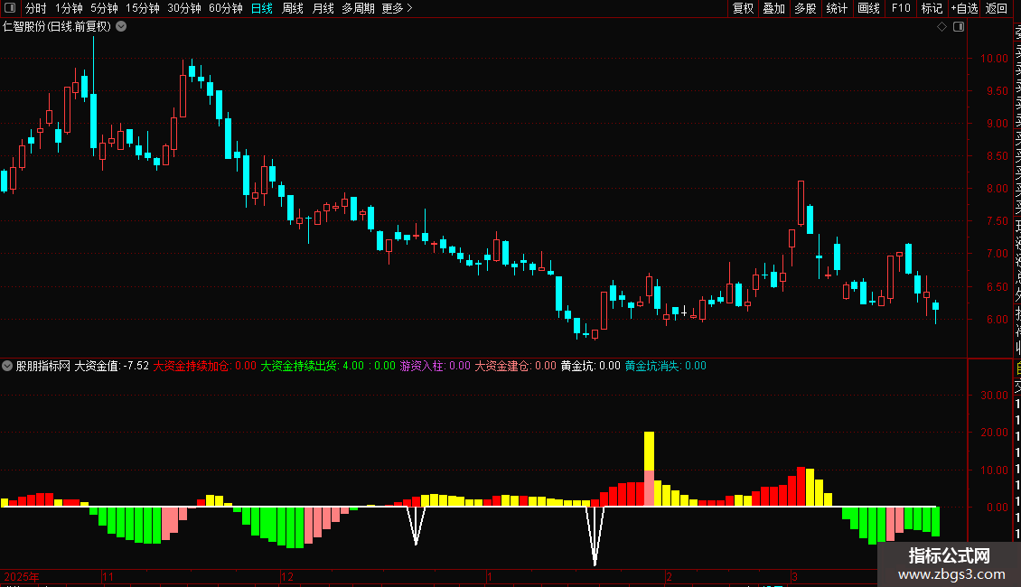STICKLINE(大资金值<0 AND XA_4<0,0,大资金值,3,0),COLORGREEN;