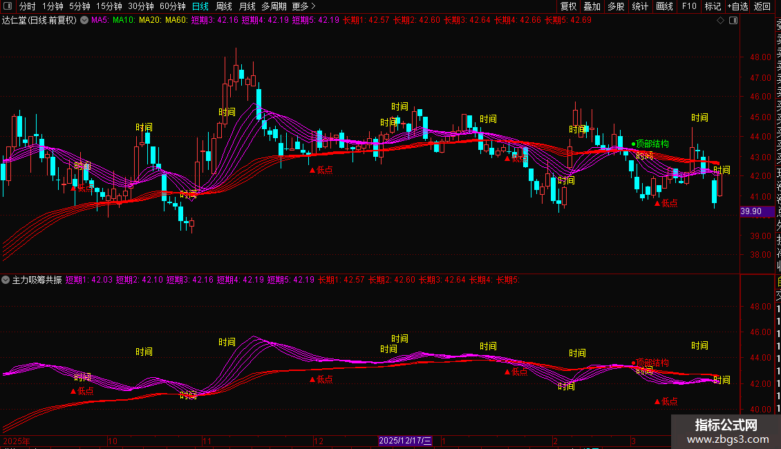 DRAWTEXT(FILTER(TG AND Q,MACD<0),H*1.02,'●顶部结构'),COLORGREEN;