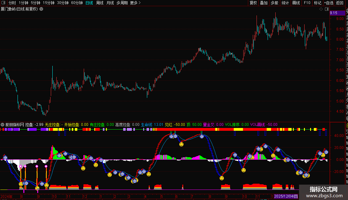 高度控盘:IF(ZVAR2>50 AND COST(85)<CLOSE AND 控盘>0,控盘,0),NODRAW;