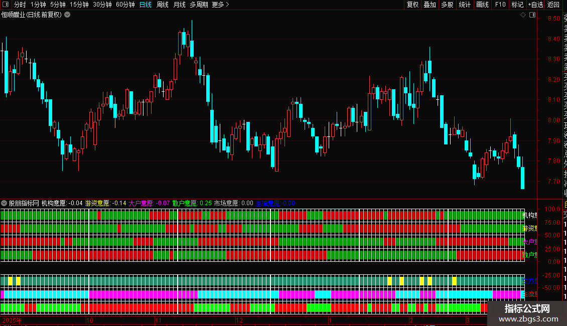 一款跟踪个股资金方向的幅图指标,通过7个方块代表各种资金意愿。十分明显的一个附图指标