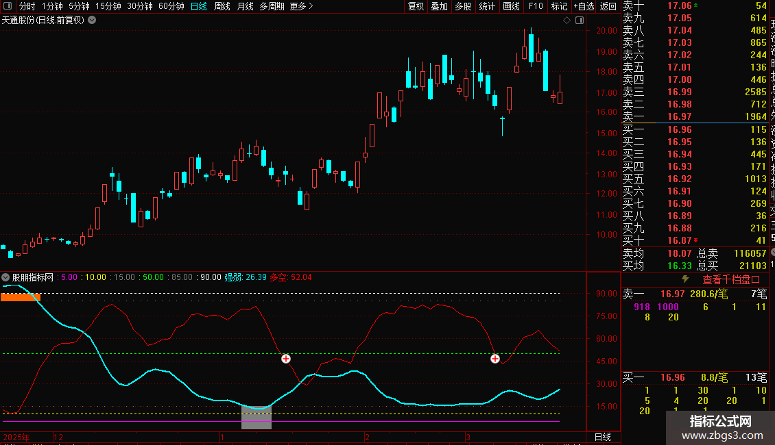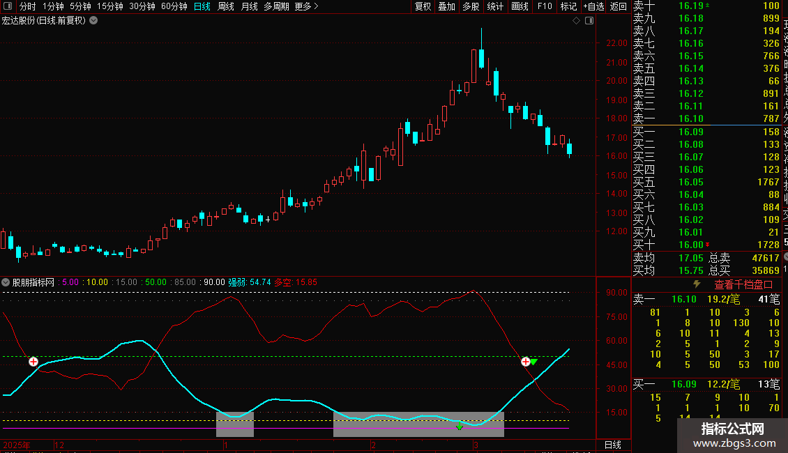 指标中有强弱线和多空线,当强弱线运行至上方出现黄色色块时,代表出现阶段底部注意代吸;反之,当强弱线运行至下方出现灰色色块时,代表出现阶段顶部,注意高抛;