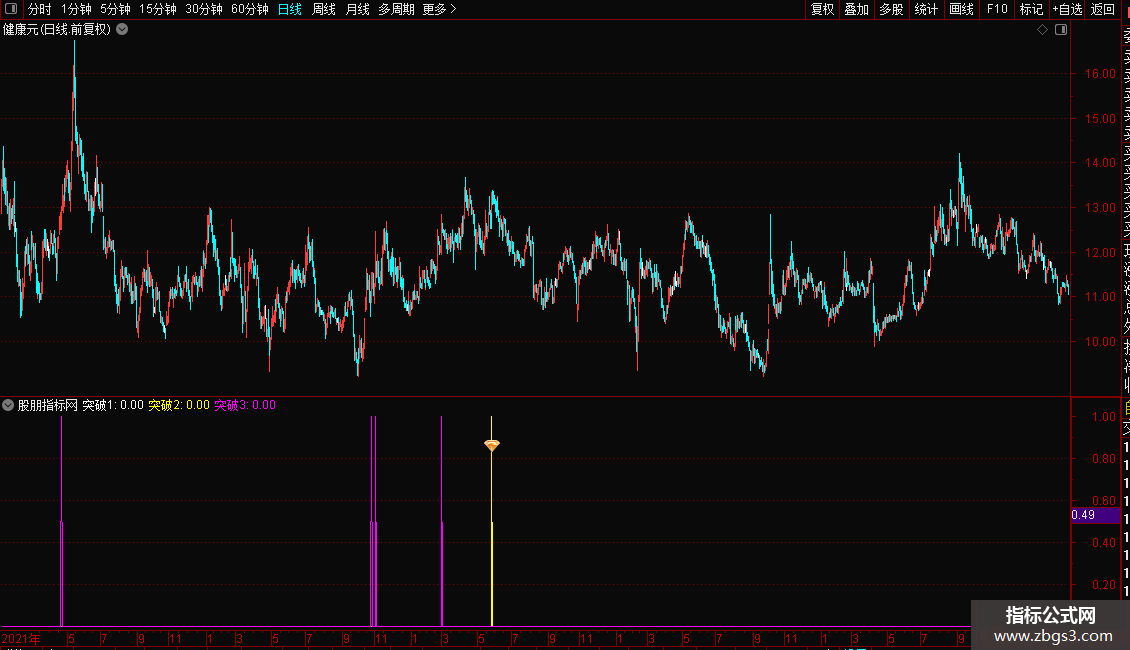 DRAWICON(突破23 AND REF(COUNT(C>O,2)=2,1),0.5,24);