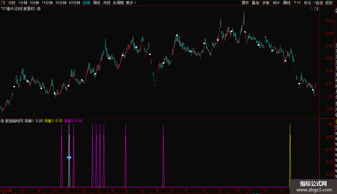 突破25:=REF(COUNT(C/REF(C,1)>1.099,3)<1,1) AND REF(O,2)<REF(H,3) AND C/O>1.037 AND C>=REF(C,3) AND C>REF(C,1) AND C>REF(C,2) AND C/O>REF(C/O,1) AND ((REF(L,2)<REF(H,3) AND REF(C/O>1.0267 AND C/REF(C,1)>1.027,5) AND (REF(C>O,3) OR (REF(C<O,3) AND C>REF(O,3))) AND REF(C/O,4)<REF(C/O,5) AND REF(C/O<1.04,4)));