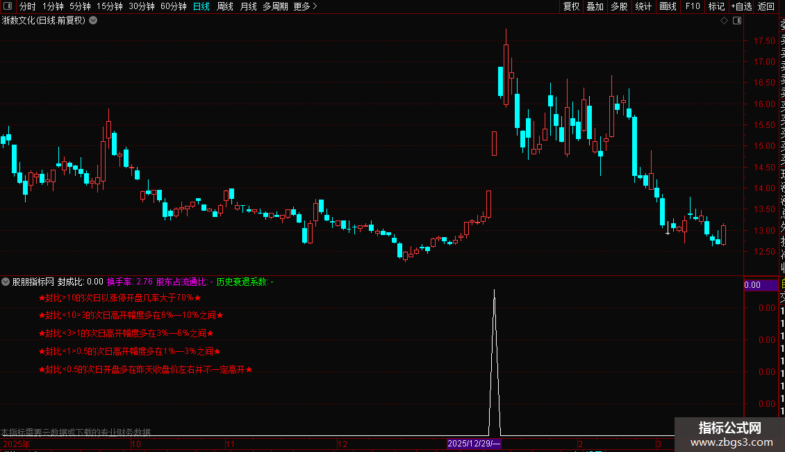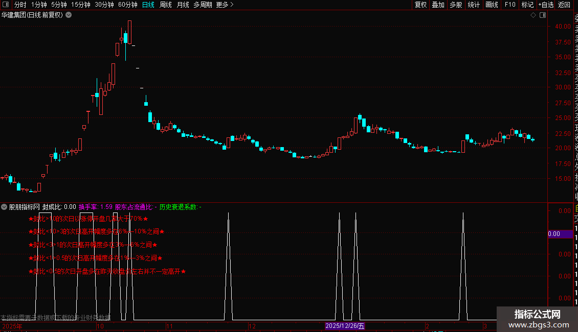 DRAWTEXT_FIX(1,0.05,0.38,0,'★封比<1>0.5的次日高开幅度多在1%—3%之间★'),COLORRED;
