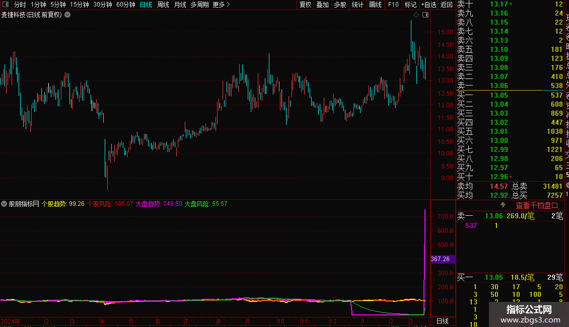 麒麟趋势指标是一个反映个股对比大盘的指标,我们知道,一个个股如果有短线资金大力推进的时候,其走势往往会独立与大盘,领先于大盘,在麒麟趋势中,表现个股趋势的是一根粗的白颜色的线,表示大盘趋势的是一根粗的绿的线,我们规定,只有当代表股价的白颜色的线向上穿越了代表大盘的绿线,才能说明个股的短线攻击强度已经具备向上攻击的能量。