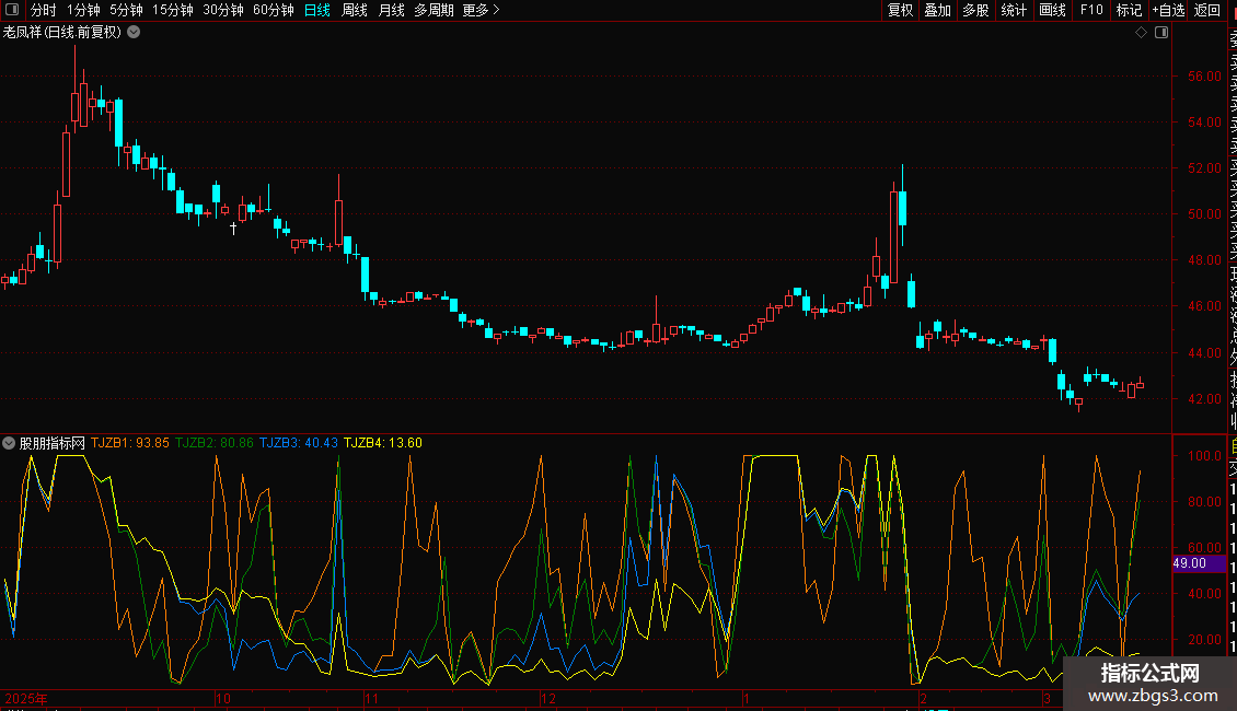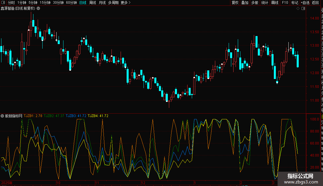由于有上下边界的技术指标在接近边界(95以上,5以下)地方钝化,图形不直观,方向性不强。能否改善这个区间,让指标的方向性更强。笔者选用了WR和RSI指标配搭,以0-100为上下界,50为中轴,上强下弱。区间(5-95)用法同RSI。由于有上下界的局限,计算时将强弱势区间(95-100,0-5)的指标值取100或0。这样使单边趋势运行的股票在持续上涨时候指标在100走平,反之在0走平。将一般技术指标的钝化表达为趋势,看起来更加直观。取5,10,20,30日来研判走势。软件中的投机指标分别用红、黄、蓝、白四线代表5日、10日、20日、30日投机指标。TJ5、TJ10、TJ20、TJ30后面的数值,则分别是四种周期投机指标当前的数值。