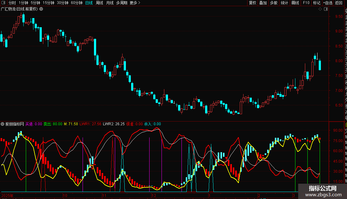卖出:IF(D>75 AND CROSS(D,K) ,80,0),COLORGREEN,STICK;
