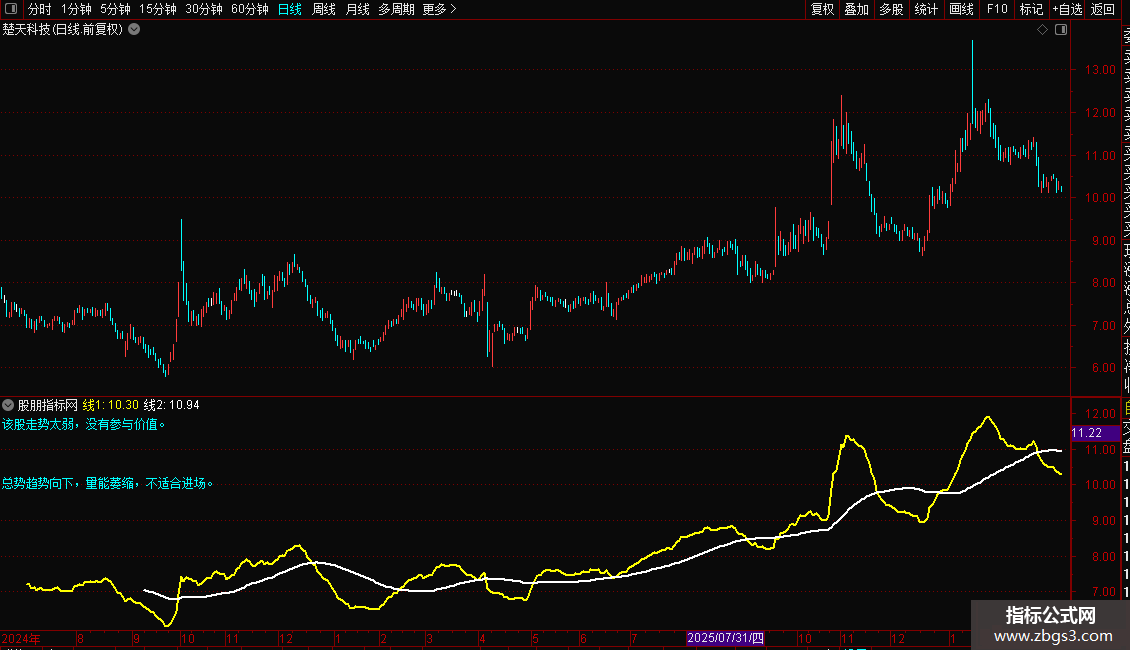 DRAWTEXT_FIX(情况13=1,0,0.00,0,'该股形态不佳,注意成交量的变化,但目前不适合参与。'),COLORCYAN;