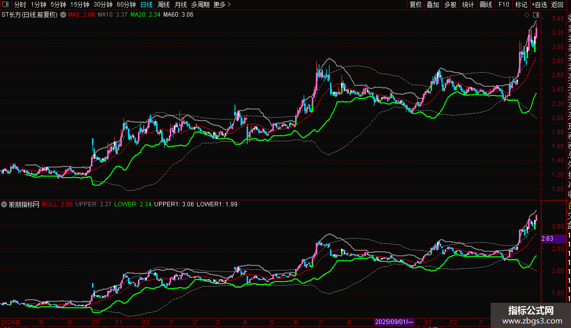 LOWER:BOLL-2*STD(CLOSE,20),COLORGREEN,LINETHICK2;