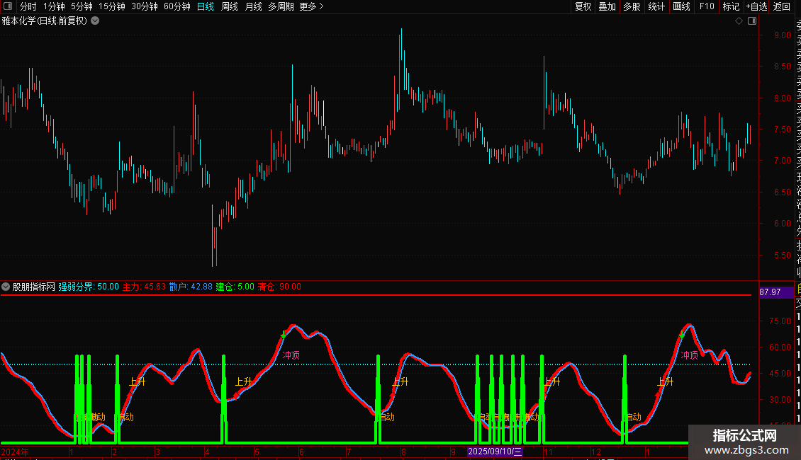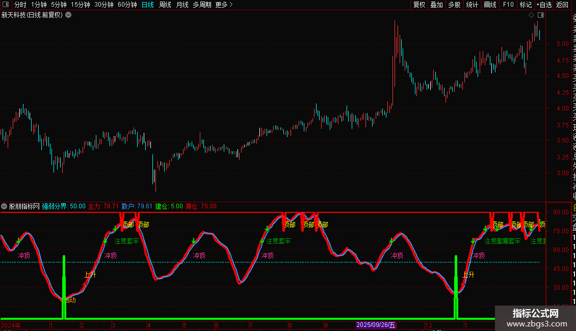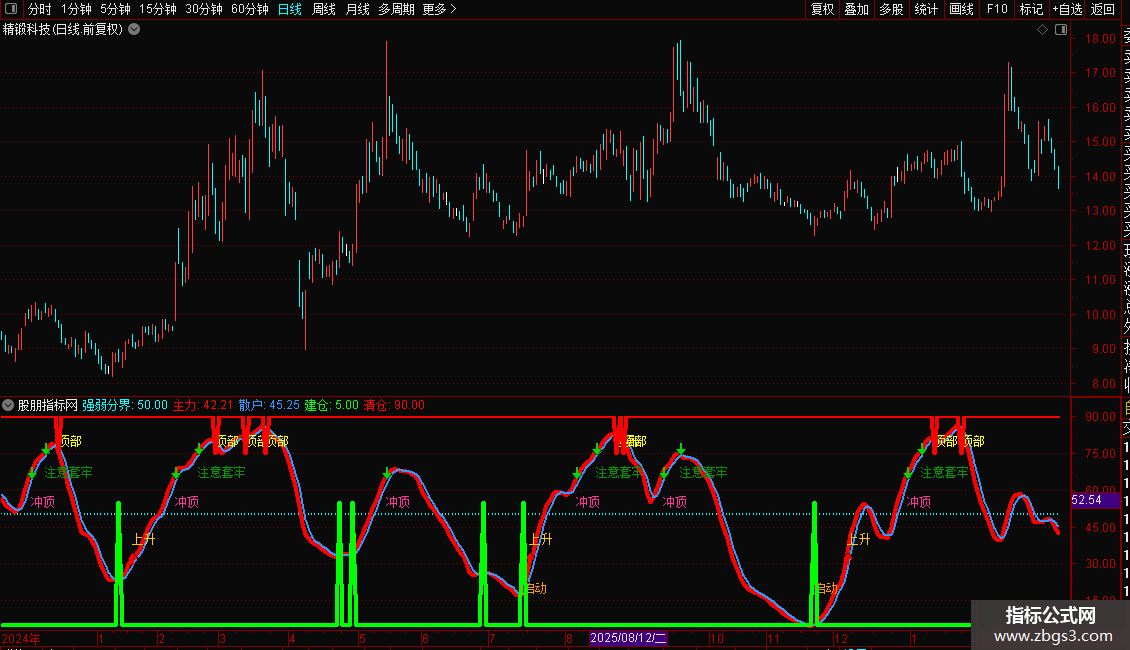 这个指标叫法不一样,有的叫华尔街之狼,有的叫启动上升冲顶,建仓防套牢公式;主力与散户和短期趋势与中期趋势都是另外一种叫法。