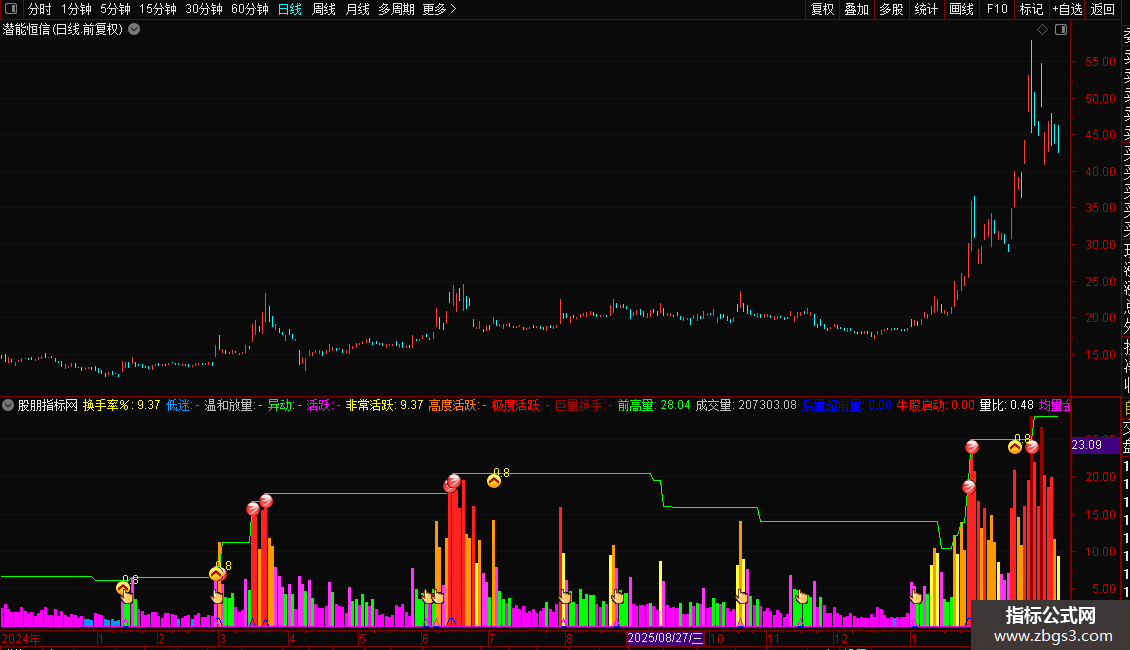 巨量换手:IF(换手率%>25,换手率%,DRAWNULL),NODRAW,COLOR000099;