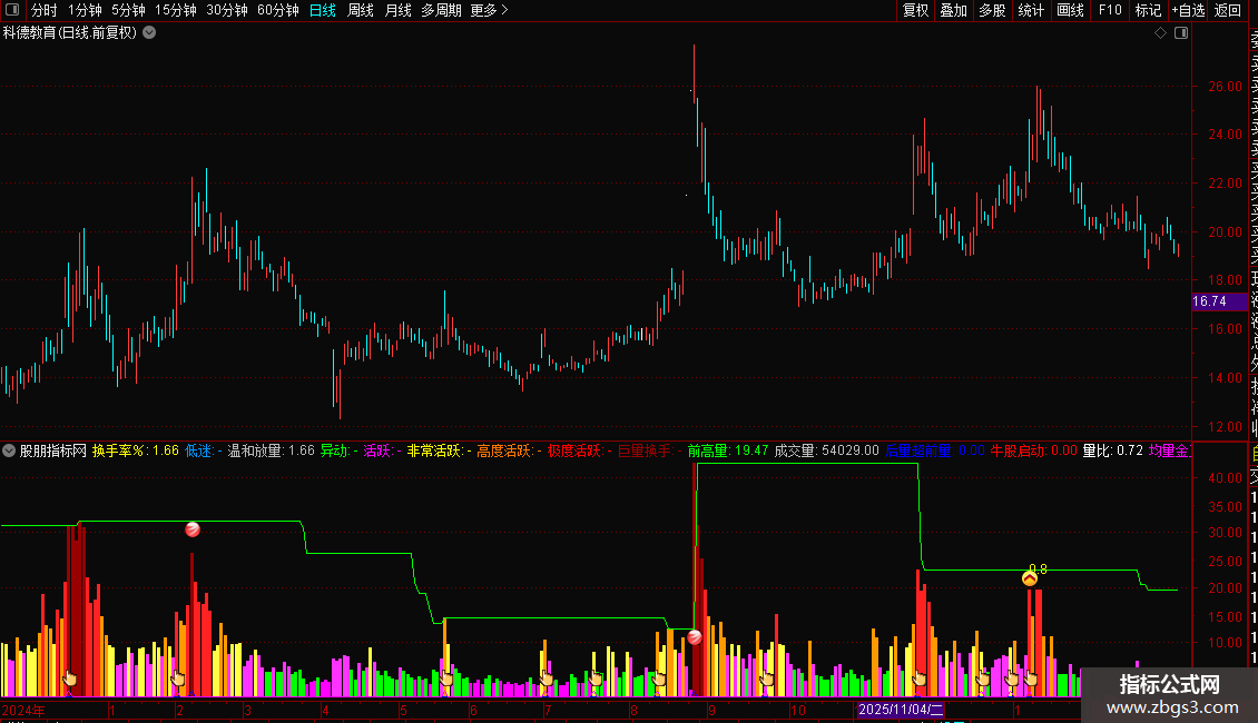 极度活跃:IF(换手率%>15 AND 换手率%<=25,换手率%,DRAWNULL),NODRAW,COLORRED;