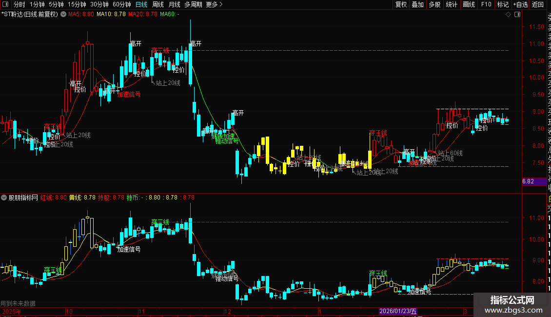 DRAWTEXT(O <= MA(C,20) AND MA(C,20) <= C , L, '↖站上20线'),COLORGRAY;