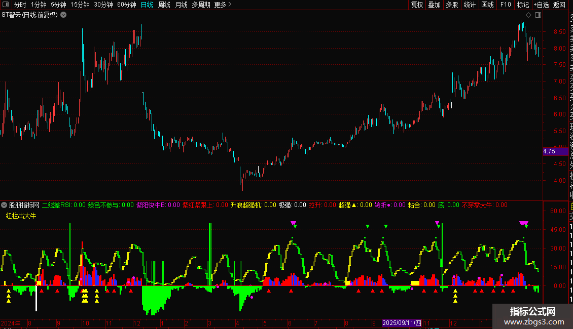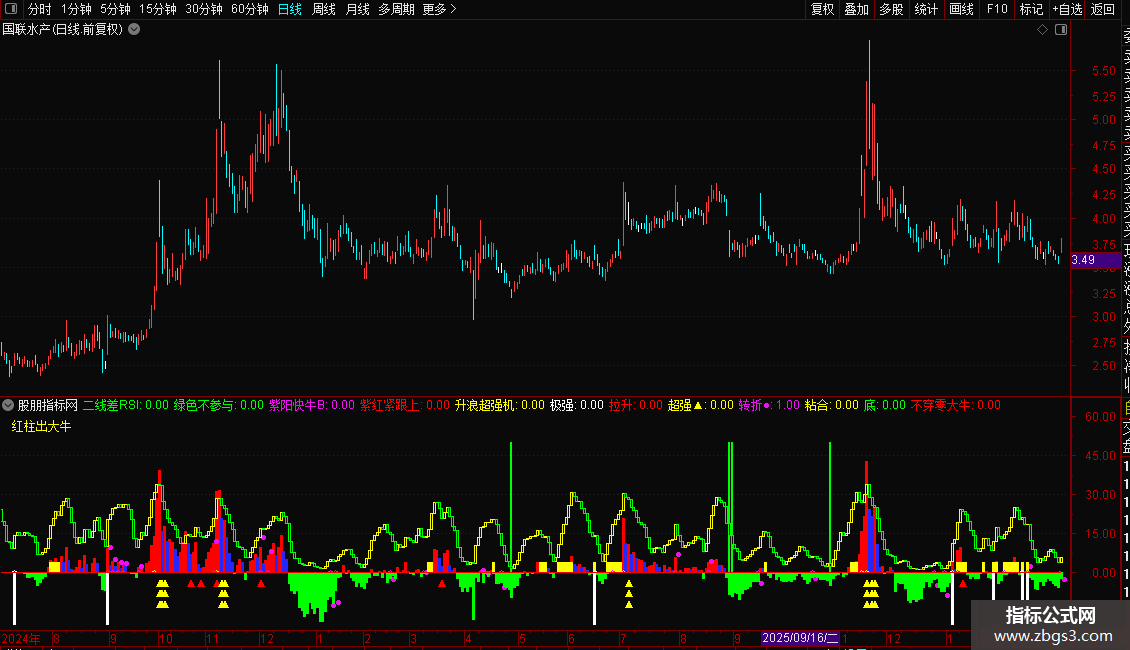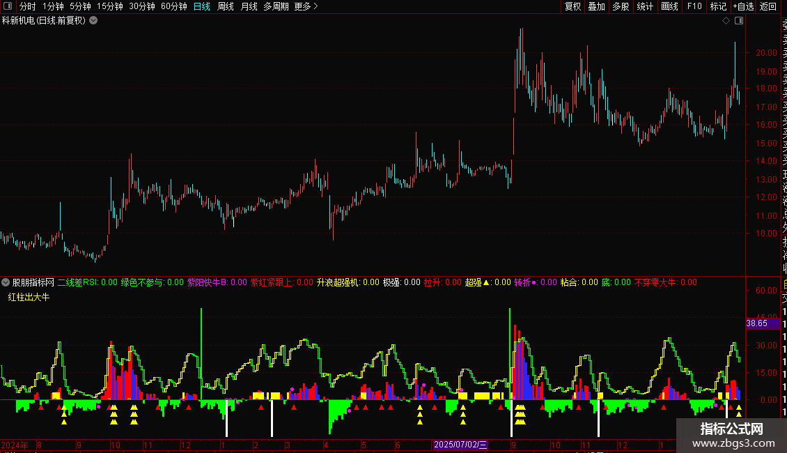 二线差RSI:IF((BB-AA)/AA>N,50,0),STICK,LINETHICK2,COLOR00FF00;