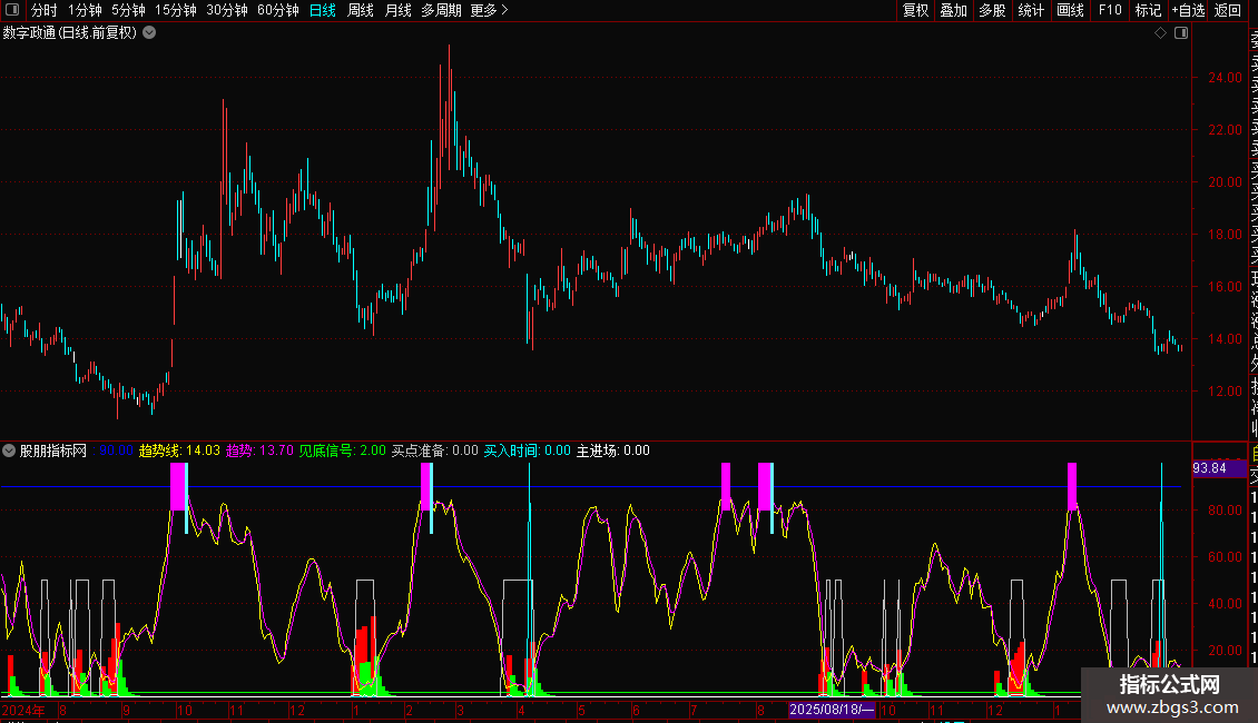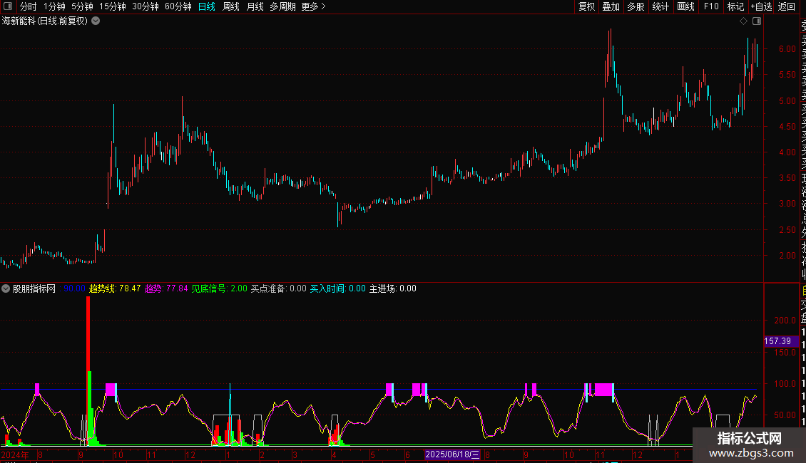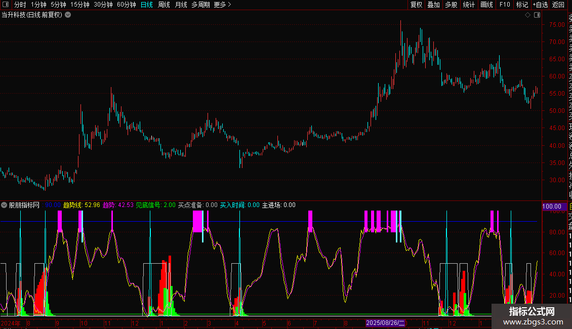 买入时间: IF(crOSS(趋势线,见底信号),100,0),COLORCYAN;