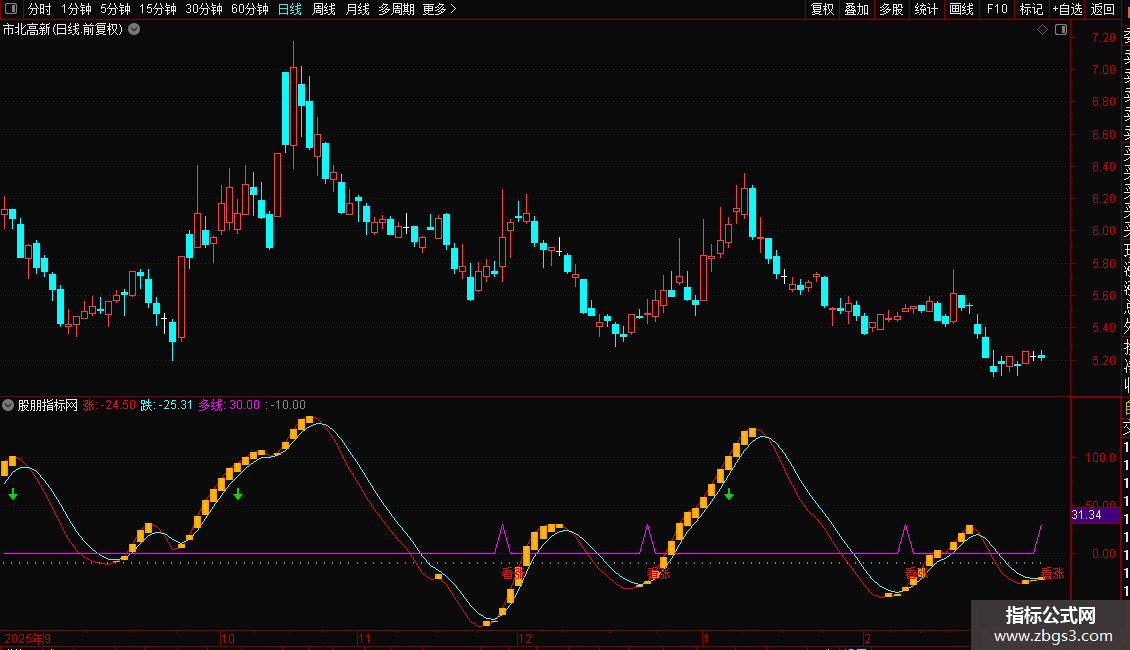 多线:IF(CROSS(涨,跌) AND 跌<-10,30,0),LINETHICK1,COLORFF00FF;
