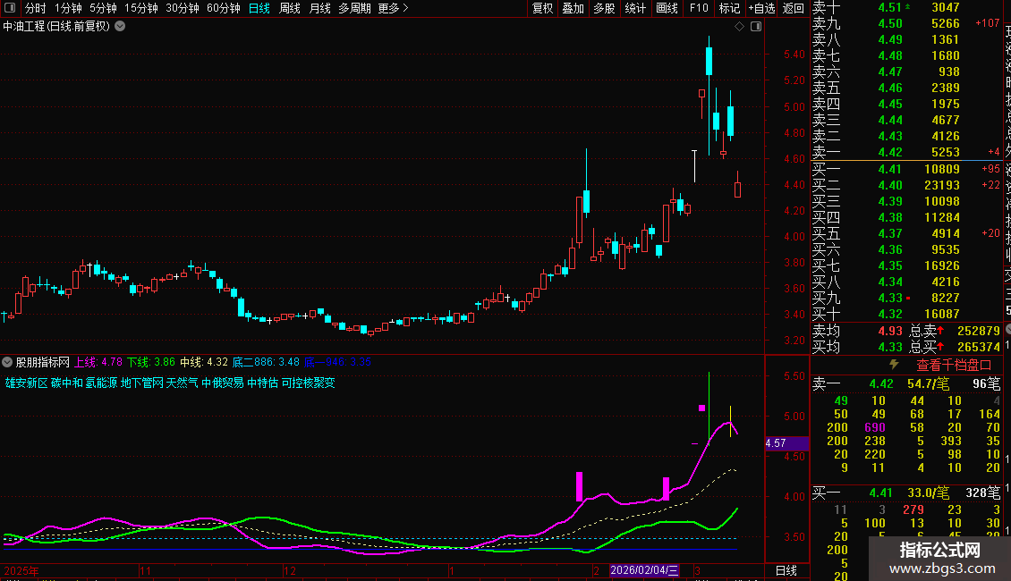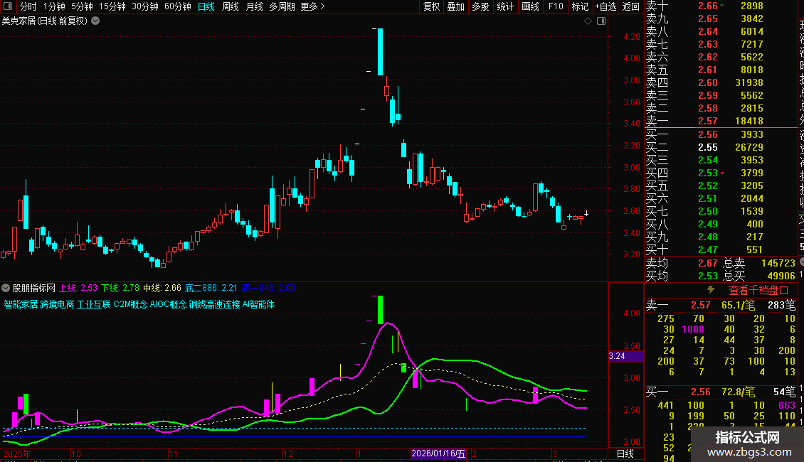 使用方法:紫色上线 上穿白线和绿线,为买入机会。辅助当下热点题材,收益不错。同时,K线亮色显示涨停和跌停,注册制20%也适用。