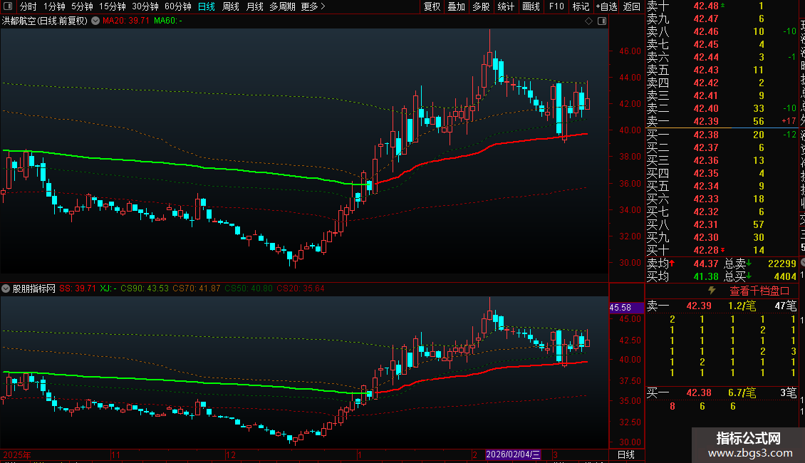 此主图由一根趋势线加四条定位线组成,红色粗线是上升趋势,绿色是下降趋势,可以看到比较强的支撑与压力,虚线是筹码成本线,可以看出筹码走向。如果需要看比较久的K线,需要设置不复权才会准确。