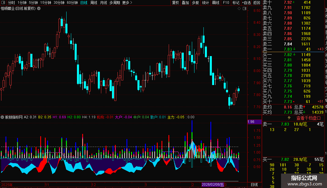 STICKLINE(机构<0,H2,H2+2*(ABS(散户)+ABS(中户)+ABS(大户)+ABS(机构)),1,0),COLORBLUE;
