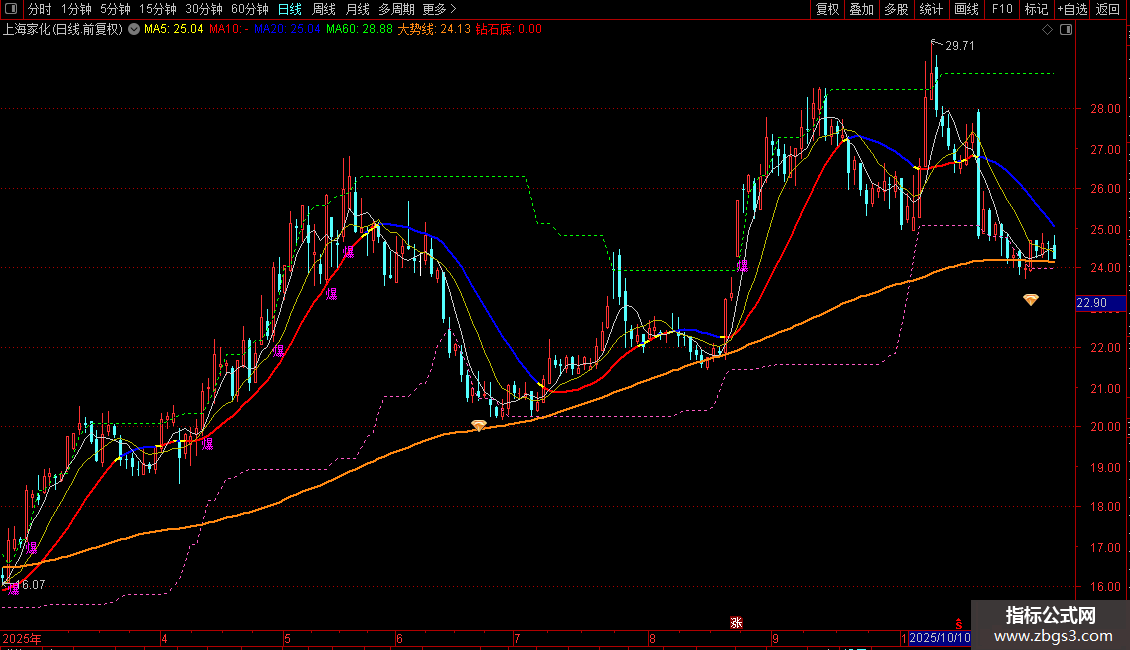 压力:MA(REF(HHV(C,30),1),2)*VAR1,COLOR00FF00,DOTLINE,;