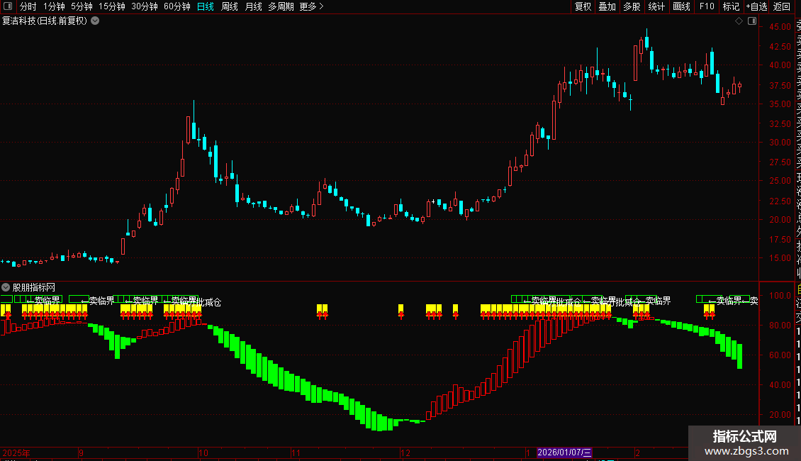 DRAWTEXT(EMA(V11,3)>60 AND EMA(V11,3)>REF(EMA(V11,3),1) AND REF(EMA(V11,3)>60 AND EMA(V11,3)>REF(EMA(V11,3),1),1)=0 AND REF(EMA(V11,3)>60 AND EMA(V11,3)>REF(EMA(V11,3),1),2)=0,96,' ←卖临界'),COLORFFFFFF;