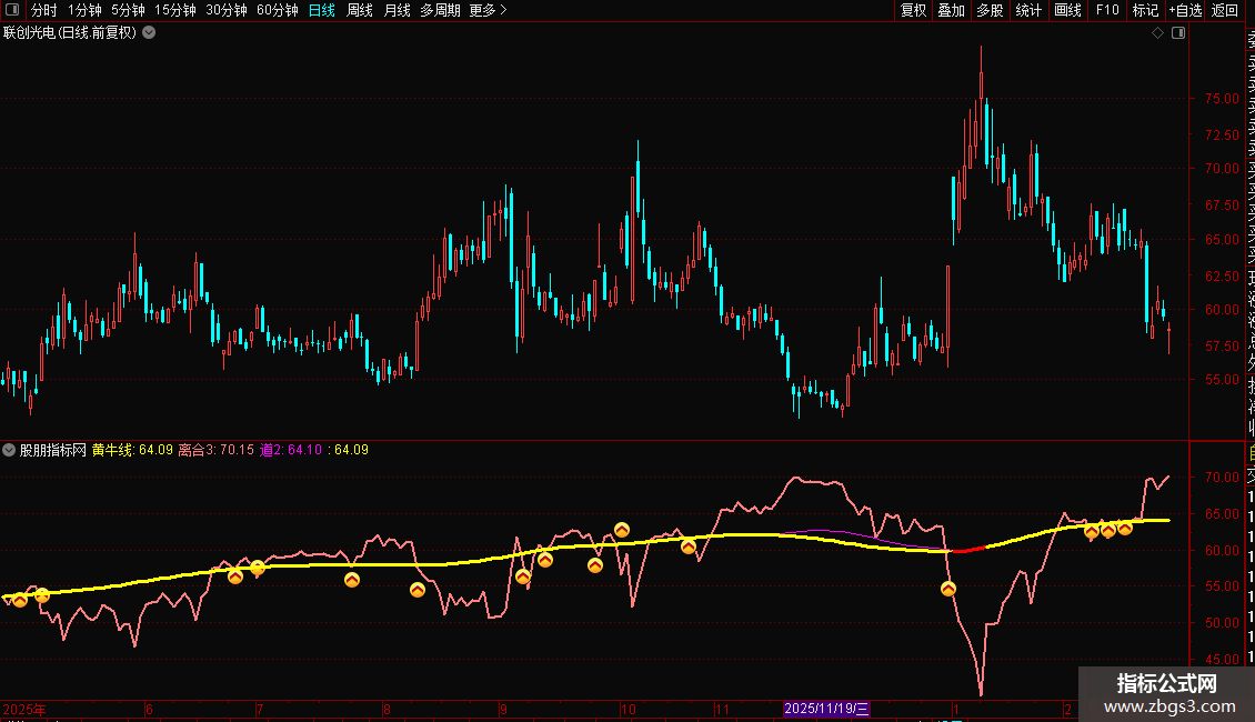 IF(C<=上轨1,黄牛线,DRAWNULL),LINETHICK3,COLORYELLOW;