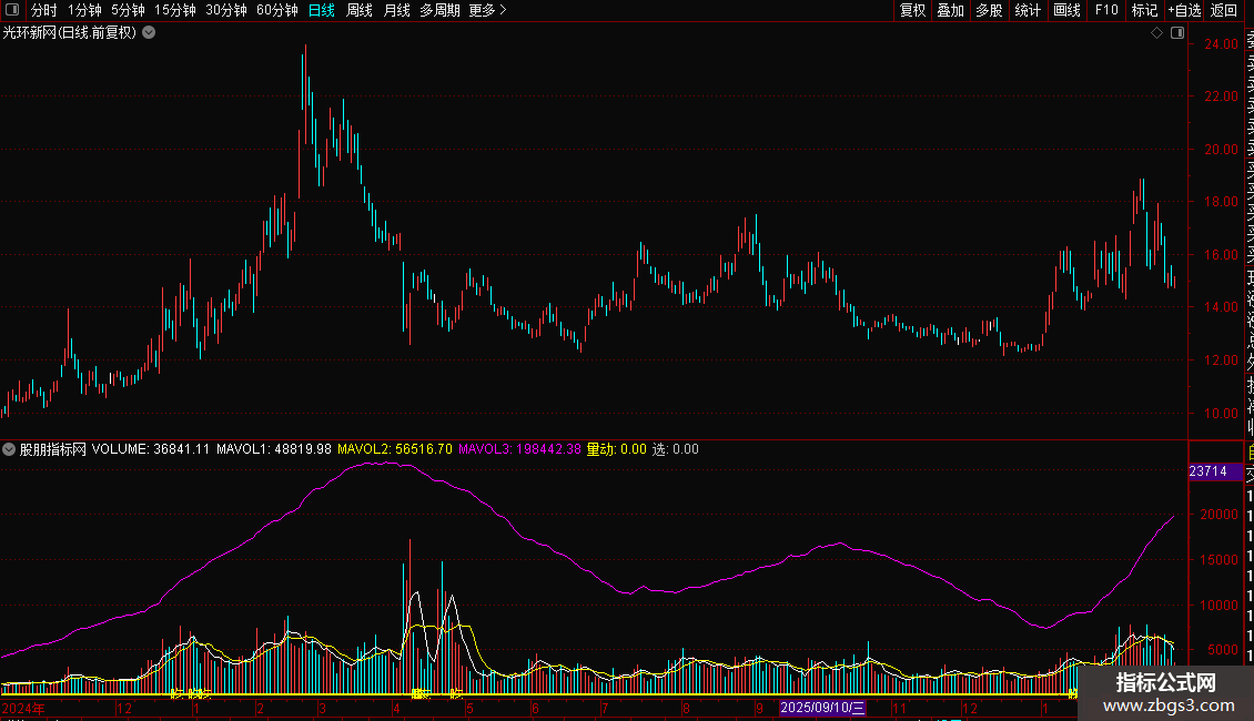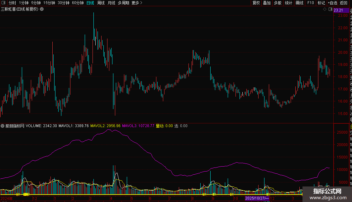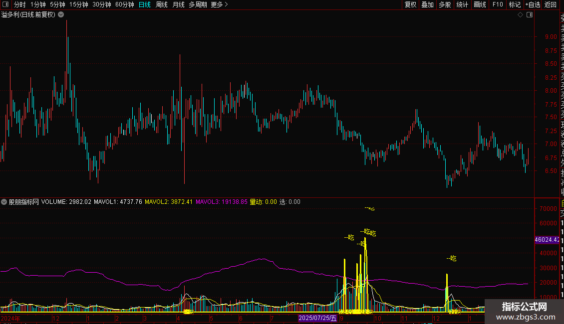 量动:IF(VOLUME>MAVOL3,VOLUME*1.5,0)COLORYELLOW,LINETHICK2;