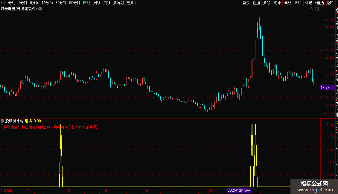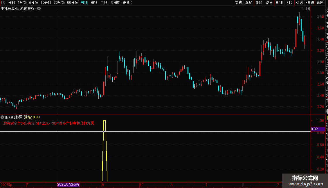 DRAWTEXT_FIX(1,0.01,0.01,0,'游资资金与超级资金同时出现,意味着多方都有拉升的意愿.'),COLORRED;