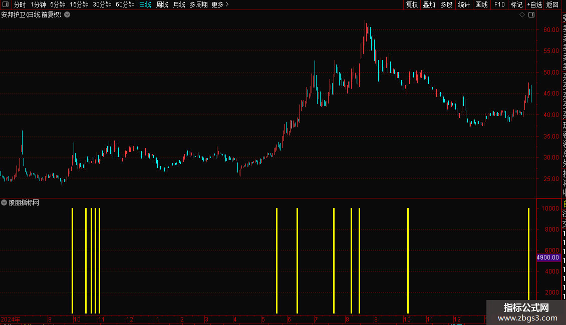 指标是以前期的高点为基点,价格突破出选股信号! 指标源码,大牛在指标下必显 ,一副一选股指标!