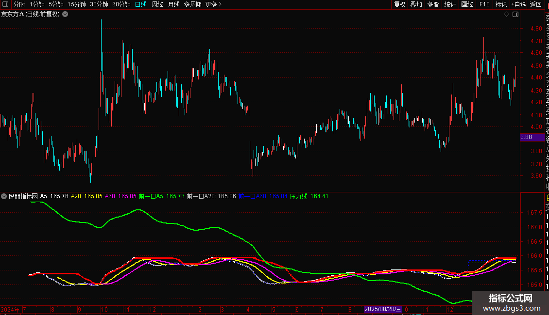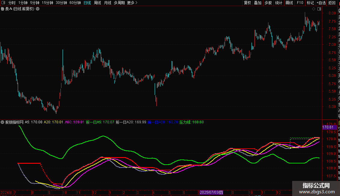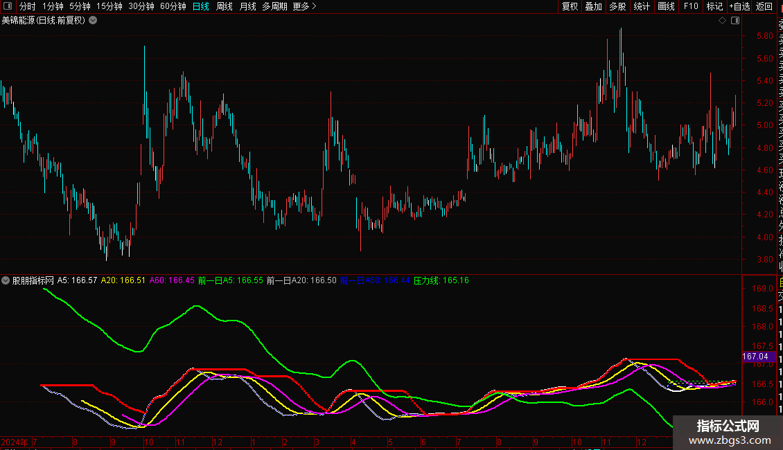 5,注意指标中前一日A5、前一日A20、前一日A60三条虚线随着股价的变化而变动,有时类似于缠论中的中枢却又有不同,当前一日A5、前一日A20、前一日A60多头排列时,股价趋势良好,当前一日A5逐渐下行,渐渐低于前一日A20、前一日A60时,注意变盘的风险。。。
