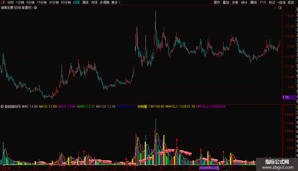 预测量:IF(CURRBARSCOUNT=1 AND PERIOD=5,VOL*240/FROMOPEN,VOL),VOLSTICK;