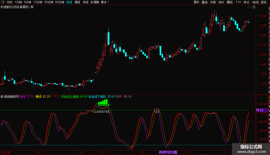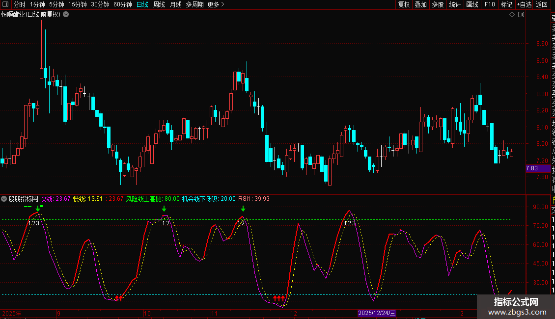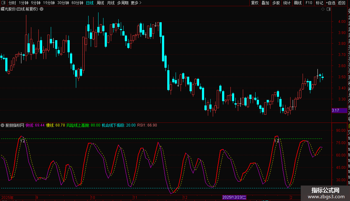 趋势线,红色上升趋势,紫色下降趋势,80以上是风险区,