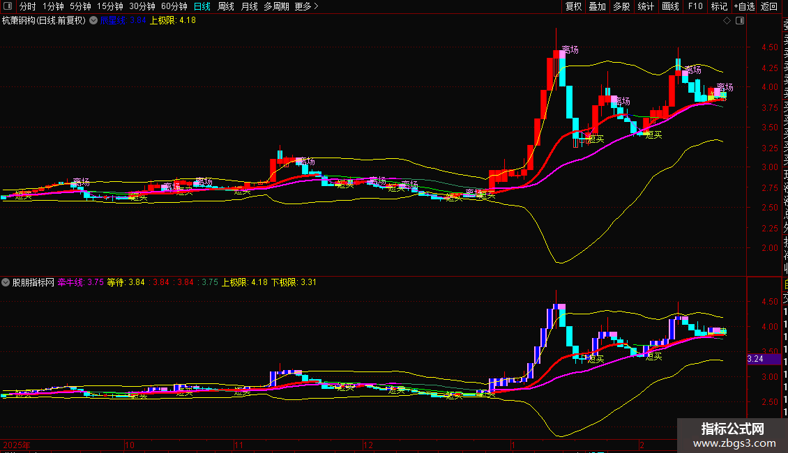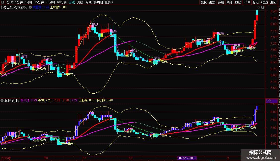 上极限:(中轨+2*STD(CLOSE,20)),COLORYELLOW;