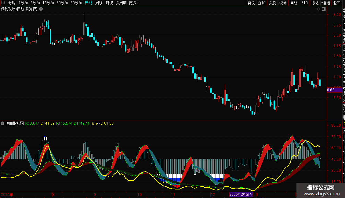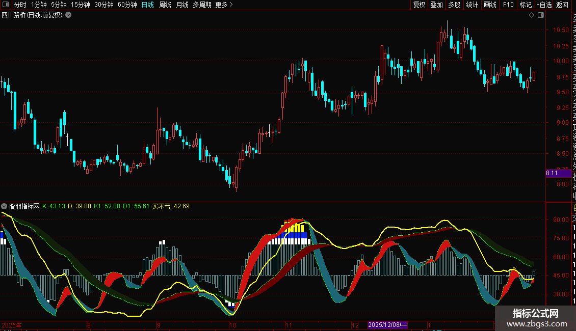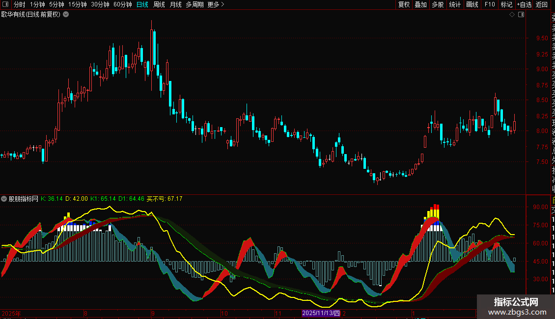 慢线KDJ(另一组K1、D1线):基于56日长周期,走势平滑,用于判断中长期趋势方向。其间的色带(深红-蓝)用于识别趋势强度。