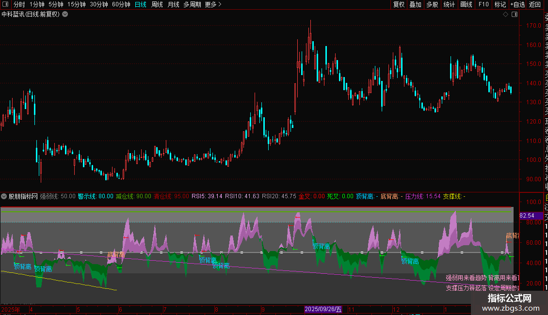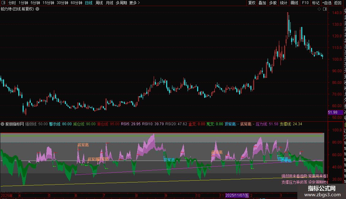 DRAWTEXT(CURRBARSCOUNT=30,25,'强弱用来看趋势 背离用来看顶底'),COLORCC99FF;