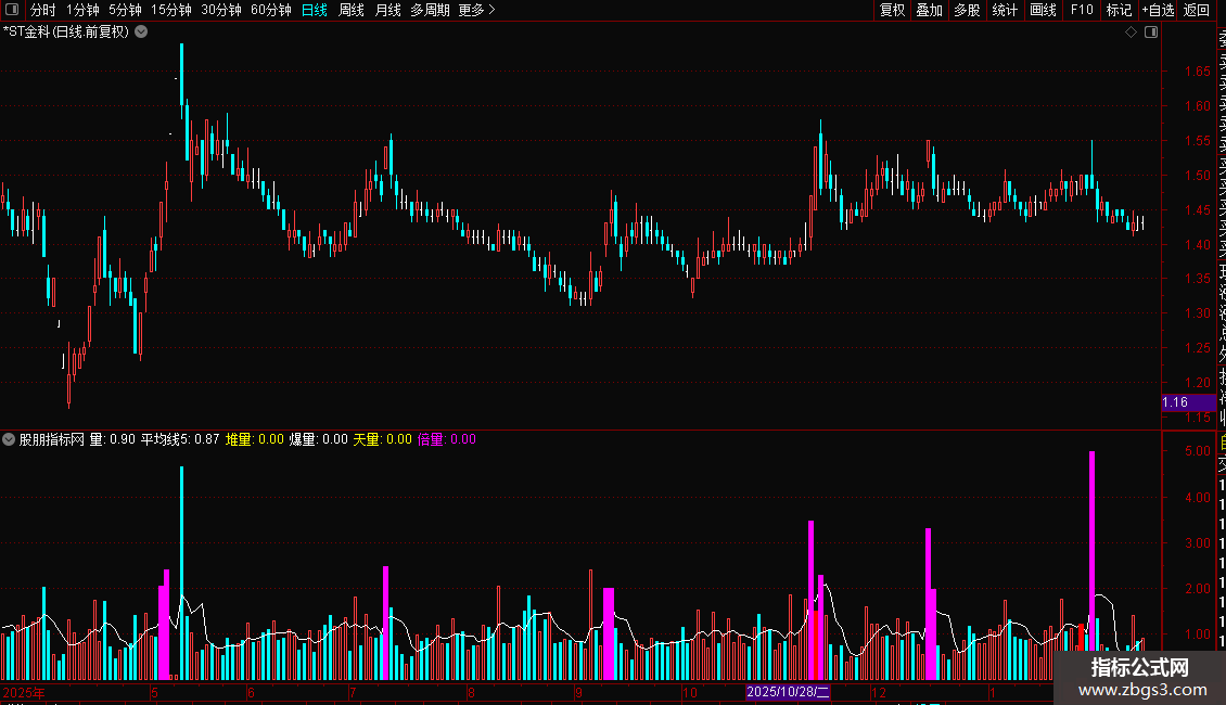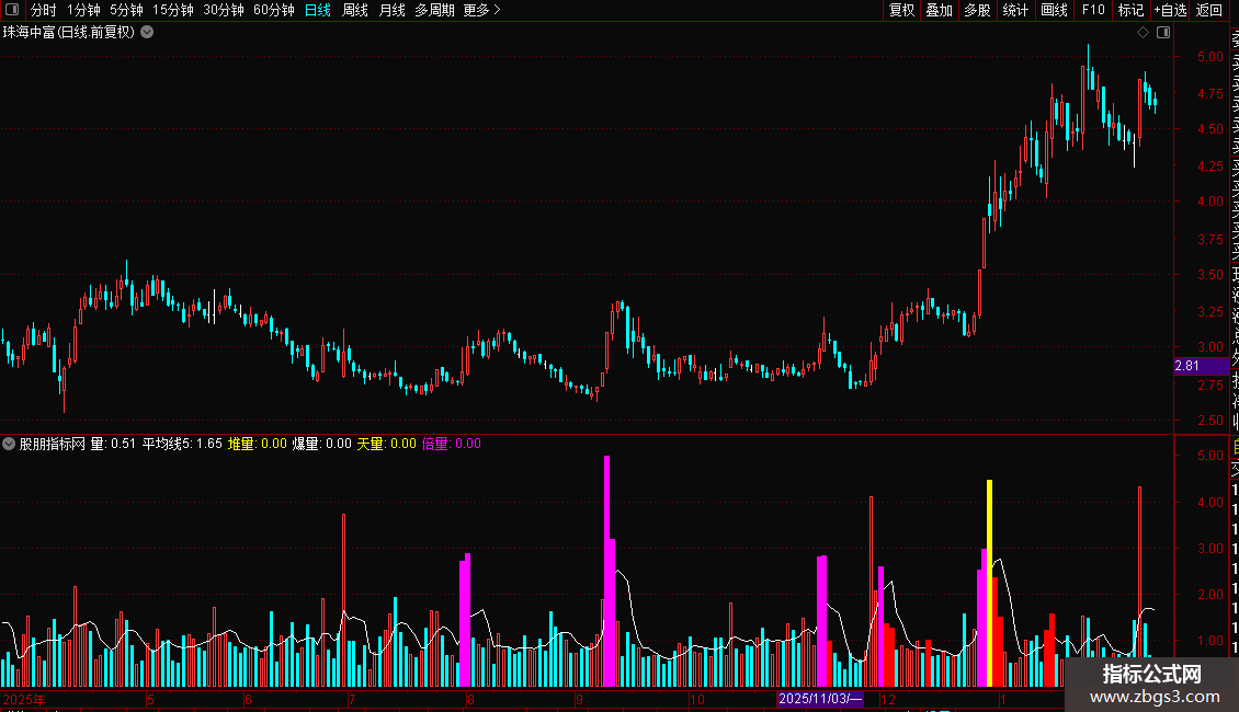 STICKLINE( 倍量>0 AND 爆量=0 ,0,量,3,0),COLORMAGENTA;