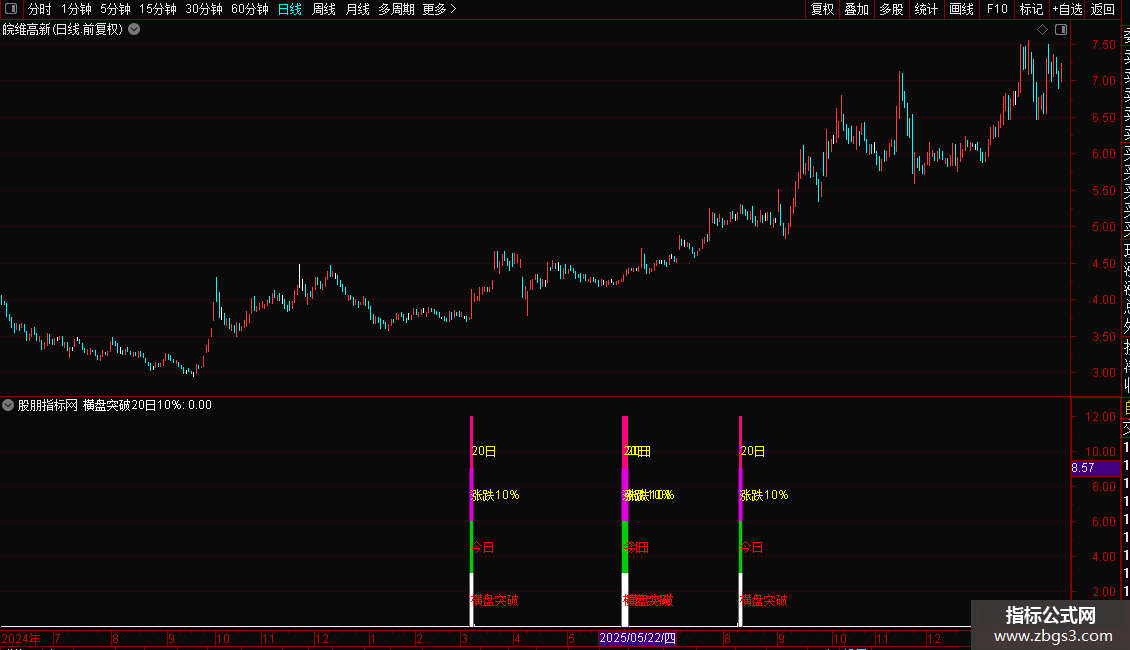 当满足条件横盘突破20日10%时,在7.5位置书写文字,画黄色