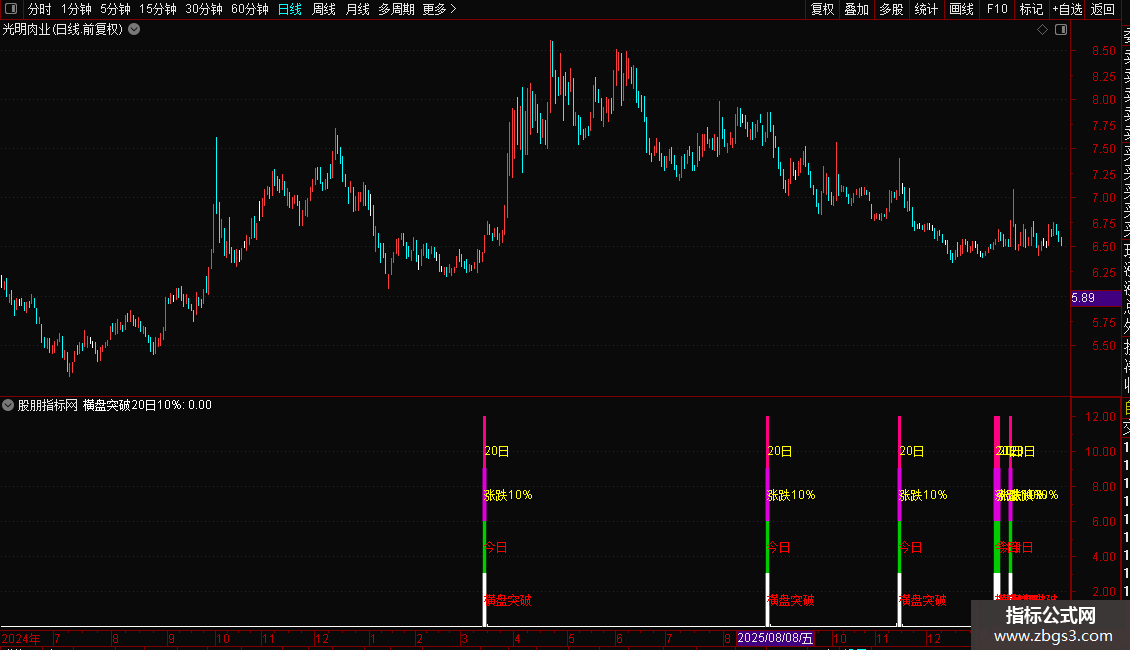 当满足条件横盘突破20日10%时,在4.5位置书写文字,画红色