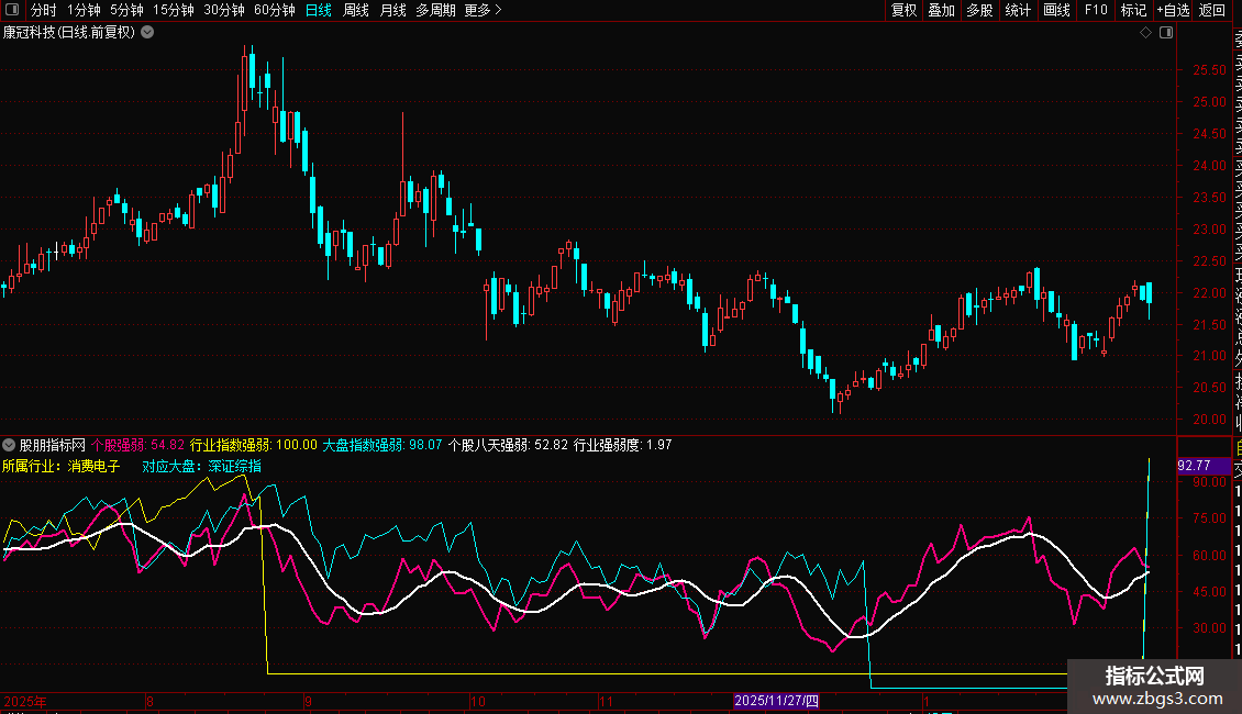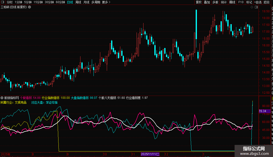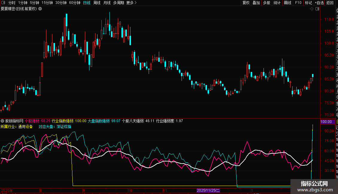 在一个副图中同时显示大盘(青色)、行业(黄色)、个股(洋红)、以及个股均线(白色)四条线。便于日常观察个股走势的强弱。