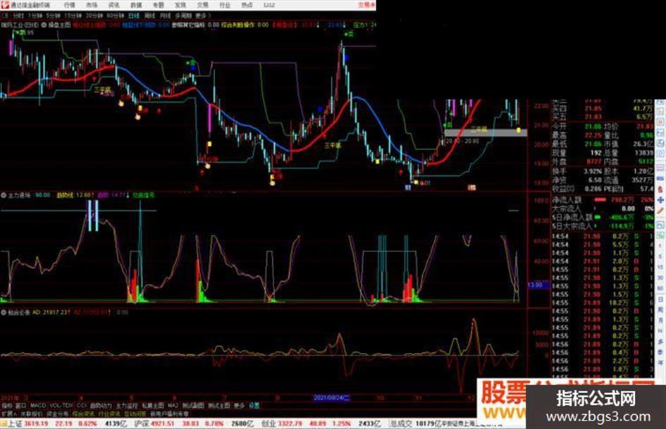 90,COLORFFFF80; VAR1:=REF((LOW+OPEN+CLOSE+HIGH)/4,1); VAR2:=SMA(ABS(LOW-VAR1),13,1)/SMA(MAX(LOW-VAR1,0),10,1); VAR3:=EMA(VAR2,10); VAR4:=LLV(LOW,33); VAR5:=EMA(IF(LOW<=VAR4,VAR3,0),3); 主力进场:STICKLINE(VAR5>REF(VAR5,1),0,VAR5,2,0),COLORRED; {洗盘:IF(VAR5<REF(VAR5,1),VAR5,0),COLORGREEN;} 洗盘:STICKLINE(VAR5<REF(VAR5,1),0,VAR5,2,0),COLORGREEN; 趋势线:3*SMA((CLOSE-LLV(LOW,27))/(HHV(HIGH,27)-LLV(LOW,27))*100,5,1)-2*SMA(SMA((CLOSE-LLV(LOW,27))/(HHV(HIGH,27)-LLV(LOW,27))*100,5,1),3,1); 趋势:EMA(EMA(趋势线,3),1); 见底信号:2; 买点准备:IF(趋势线<=10,50,0); 买入时间:IF(CROSS(趋势线,见底信号),100,0),COLORCYAN; 主进场:IF(VAR5>REF(VAR5,1),1,0),COLORRED; 卖出警戒:STICKLINE(趋势线>=85,100,80,2,1),COLORMAGENTA; 止损出局:STICKLINE(CROSS(90,趋势线),100,70,3,0),COLORFFF666;