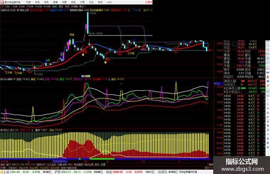 波段买入:IF(CROSS(绿色,粉色),白色*1.05,粉色),,COLORFF00FF,LINETHICK2;